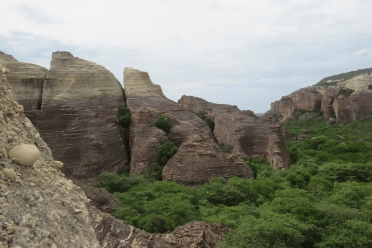 Composição formada por triângulos e cunhas. Esse trabalho exigiu atenção sobre elementos como ritmo (em repetição de linhas paralelas), simetria (continuidade das linhas verticais) e profundidade (em cores escuras nas divisões), para destacar as formações naturais da Serra da Capivara.