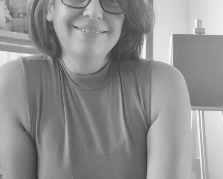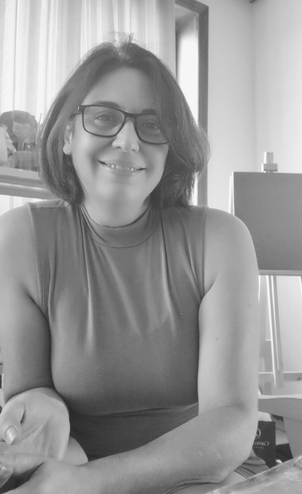 Andrea Portela, 1971, vive e trabalha em Juiz de Fora MG, e transita entre o Rio de Janeiro RJ, onde estuda pintura e processos com o mestre Roberto Tavares no Centro de Artes Calouste Gulbenkian, desde 2024. Sua primeira formação foi em Pedagogia (1993), anos depois se formou em Designer de Moda (2007), logo se tornou Mestra em Estudos de Cultura Contemporânea (2010) e Doutora em Ciências Sociais- Antropologia (2017). Em 2023, conheceu a gravura no curso do professor Daniel Dantas, em Juiz de Fora MG. Também realizou o curso Da criação à exposição, de Sérgio Fingermann. E, em 2025, começa a elaborar o projeto artístico com o Núcleo Contemporâneo. Atualmente, estuda arteterapia.